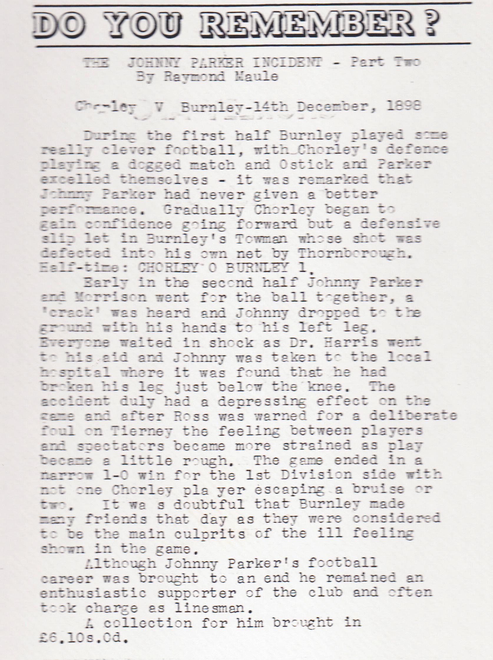 Match report of that fateful game for Johnny Parker – play became a little rough is probably a bit of an understatement
