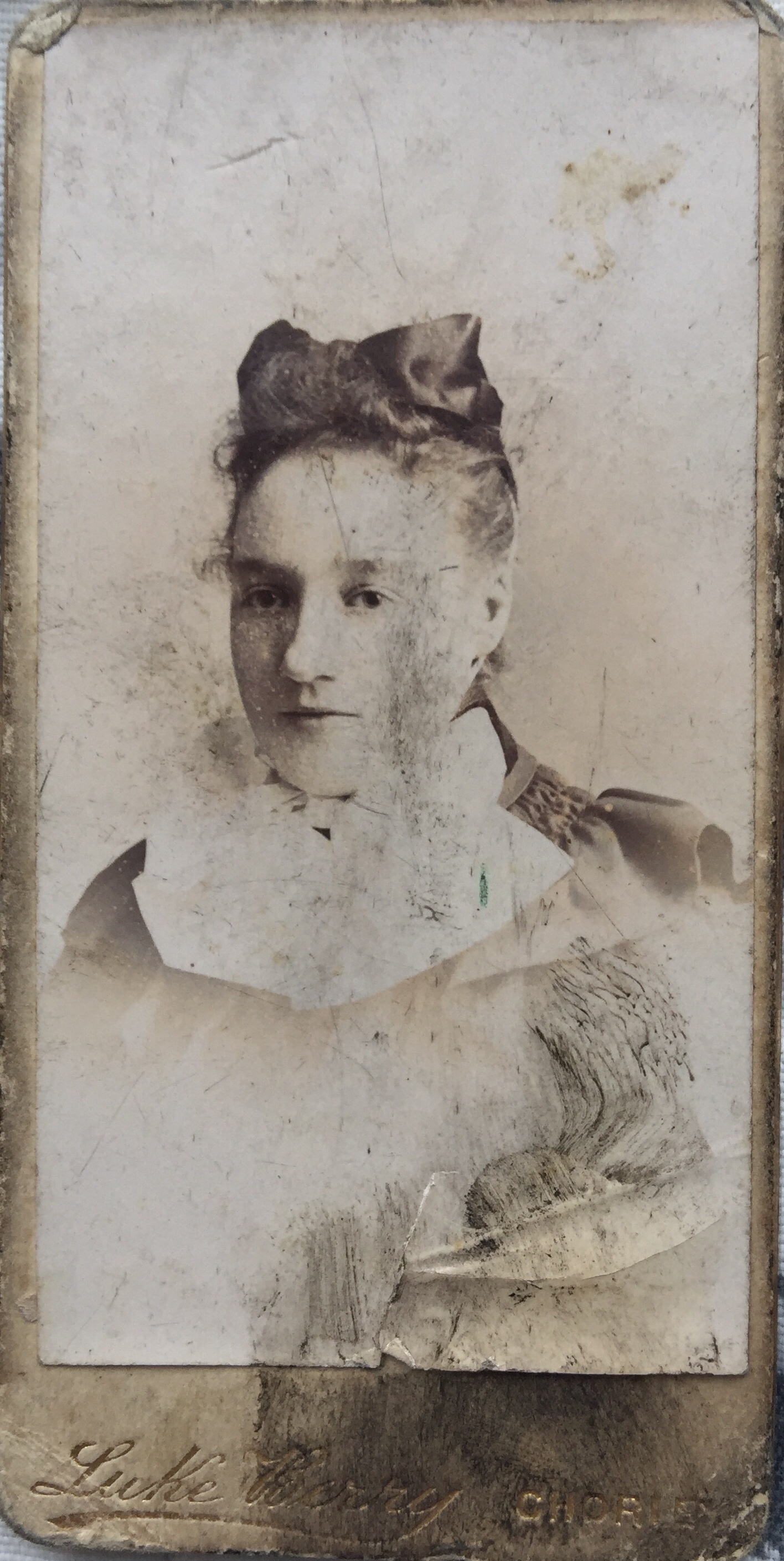 My interest was further aroused by a posting online of a photo from the same Darwen studio of Lindsey. I had discovered during my family history research that Margaret’s son Bartholomew had settled in Darwen with his wife and family. He did well for himself and his sons and daughter made good progress in Darwen society. It was a far cry from the poverty surrounding the mills of Preston and a vast contrast to the life my other side of the family was leading at the time in the slums of central Darwen. It was presumably Bartholomew that arranged for the portrait of his mother to be taken.