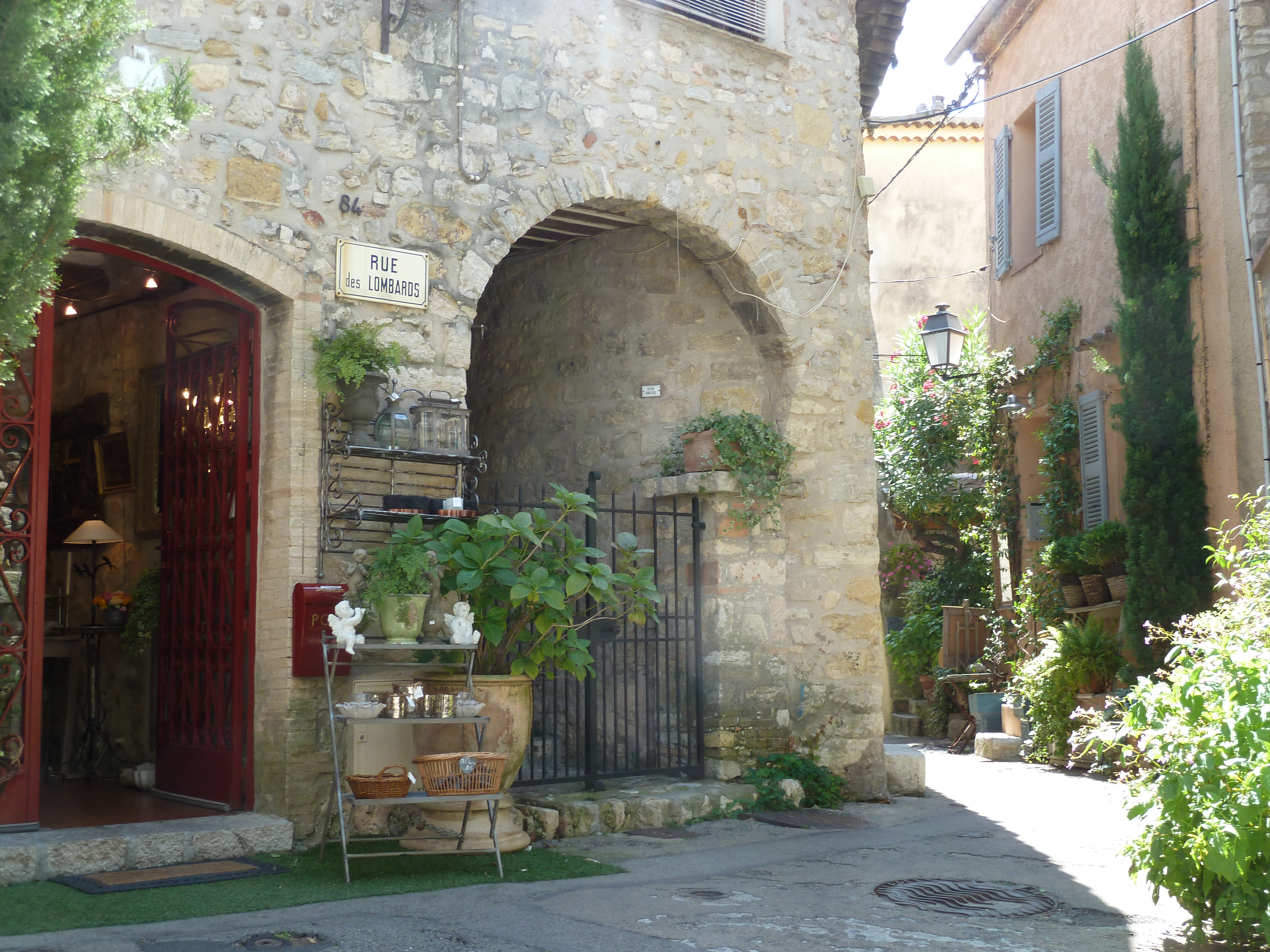 Atmospheric street and shop in village of Mougins Provence France. Read more in my French travel books on Kindle Unlimited. Read about Paris, Provence and French wine in my French travel guides. A tour of France, French People, French Places and French wine and vineyards. Neal Atherton French Travel writer or Paris Books & Provence travel books