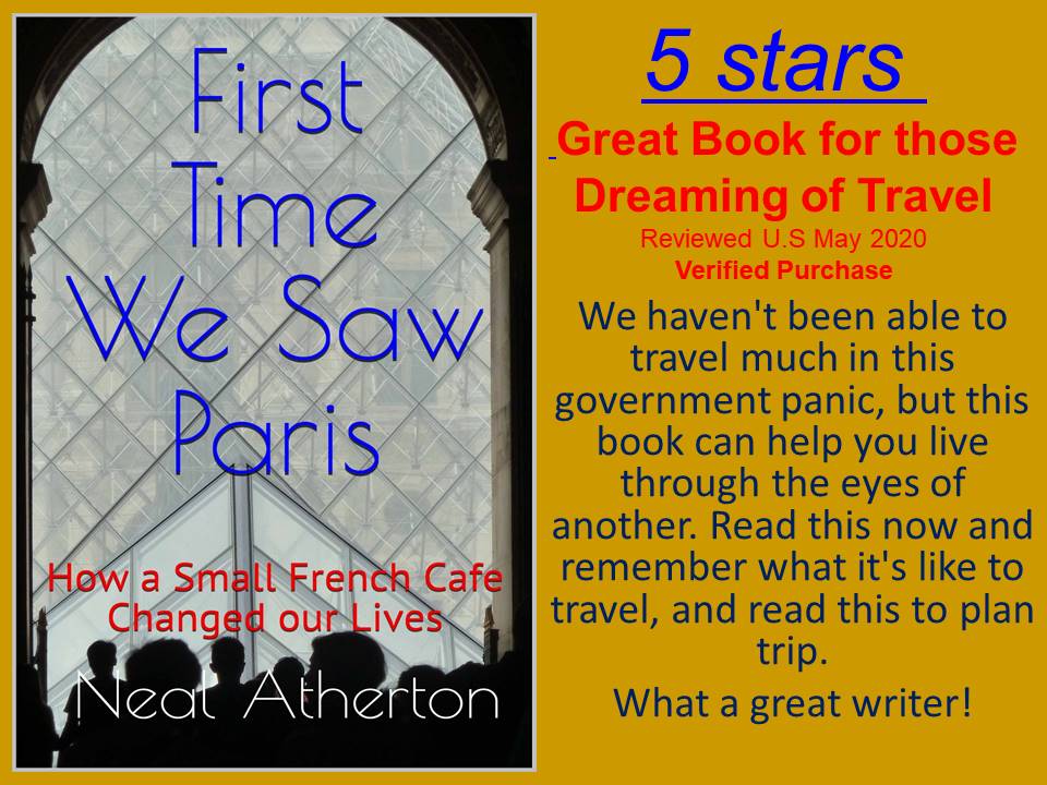 First Time we saw Paris – French travel book review on Amazon. Read more in my French travel books on Kindle Unlimited. Read about Paris, Provence and French wine in my French travel guides. A tour of France, French People, French Places and French wine and vineyards. Neal Atherton French Travel Books – Travel Book writer of Paris Books & Provence travel books